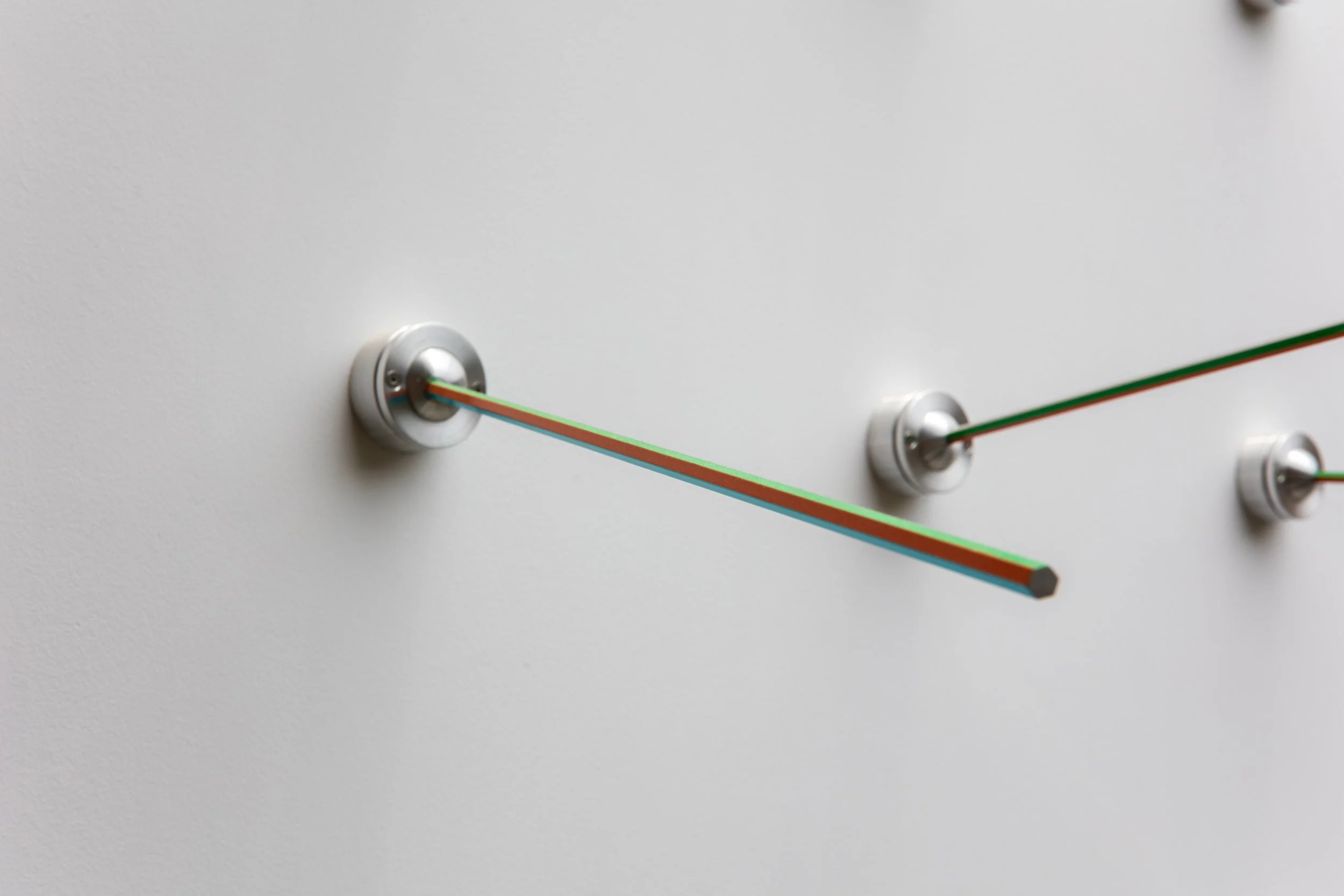 The distance between each one of the 153 connectors is 30 cm. The wall is mapped out into 30 cm grid increments. The installation began at the centre of the wall, drilling the first connector. Every 30 cm, another connector was installed, and the entire 6 x 4 meters wall was covered. Before the sunlight illuminates the wall (around 10:55 am), its rays reflect on the mirrored polished side of the aluminium bar and project bright reflected lines on the wall. This spectacle continues throughout the day, with the projected and shadow lines in constant flux.